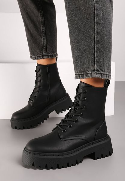 Czarne Botki Workery na Grubej Podeszwie ze Sznurowaniem Sailia