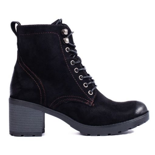 W. Potocki Sznurowane botki damskie na obcasie Potocki z zamszu ekologicznego czarne