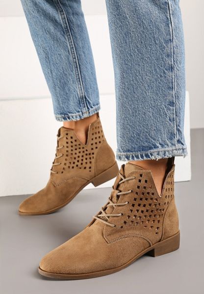 Ciemnobeżowe Botki Vices z Ażurową Cholewką i Wycięciem oraz Skórzaną Wkładką Elixa