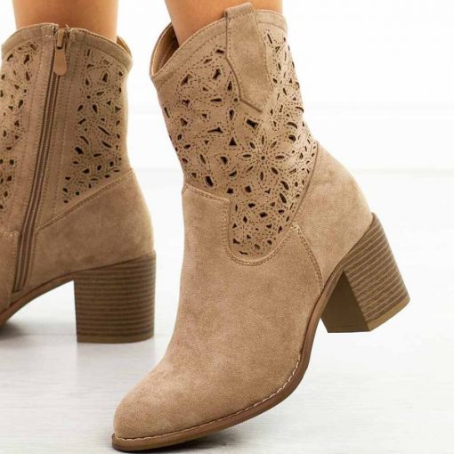 Beżowe jesienne zamszowe ażurowe botki damskie na obcasie S.Barski 51-125