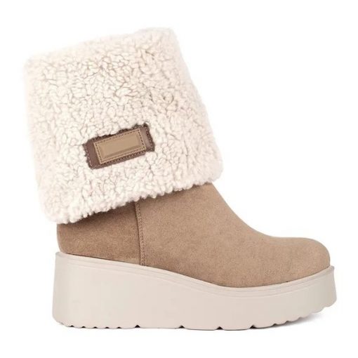 Seastar Ciemnobeżowe ocieplane botki damskie na koturnie beżowy