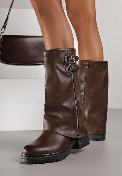 Brązowe Botki z Cholewką Imitującą Nogawkę z Suwakiem i Klamrami Devea