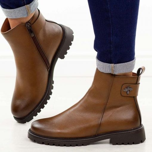 Brązowe botki damskie na traperzeto połączenie wygody, nowoczesnego designu i solidnego wykonania. Wykonane z wysokiej jakości materiału skóropodobnego, gwarantują trwałość i odporność na codzienne użytkowanie. Cholewka ozdobiona metalicznym akcentem w kształcie owada nadaje butom wyjątkowego, modnego charakteru. Botki są zapinane na suwak, co ułatwia zakładanie i zdejmowanie. Okrągły nosek zapewnia komfort podczas noszenia, a wnętrze ocieplone […]