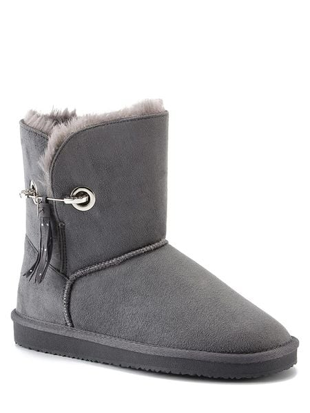 – wodoodporny materiał wierzchni o wyglądzie skóry welurowej („Microsuede”)- zapięcie: bez- noski: zaokrąglone- detale: ozdobne i formujące szwy, chwosty – zapiętki: wzmocnione- wyściółka: ciepła- podeszwa: antypoślizgowa- kolor producenta: grey