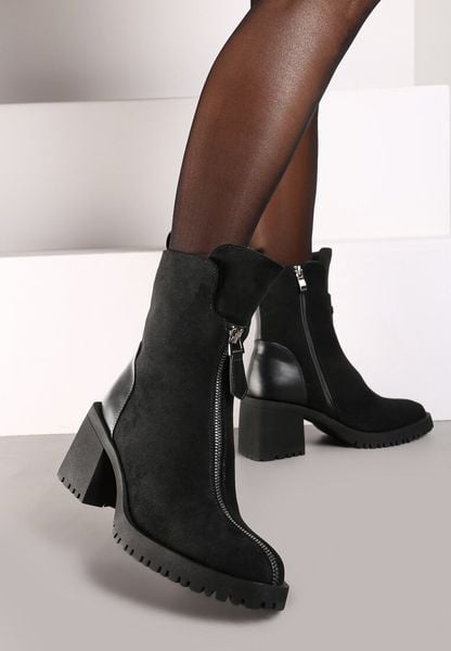 Czarne Botki na Słupku z Ozdobnym Suwakiem i Lekkim Ociepleniem Rexitha