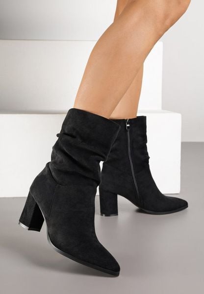 Czarne Botki na Słupku z Marszczoną Cholewką z Imitacji Zamszu Nalurine