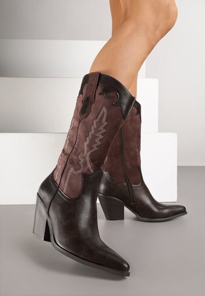 Brązowe Botki Kowbojki na Stożkowym Obcasie Zdobione Haftem Nalirria