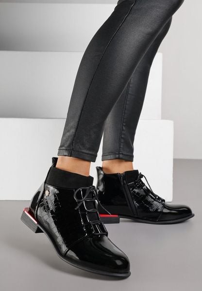 Czarne Botki Lakierowane Vices ze Sznurowaną Cholewką i Tłoczeniem Uzvila