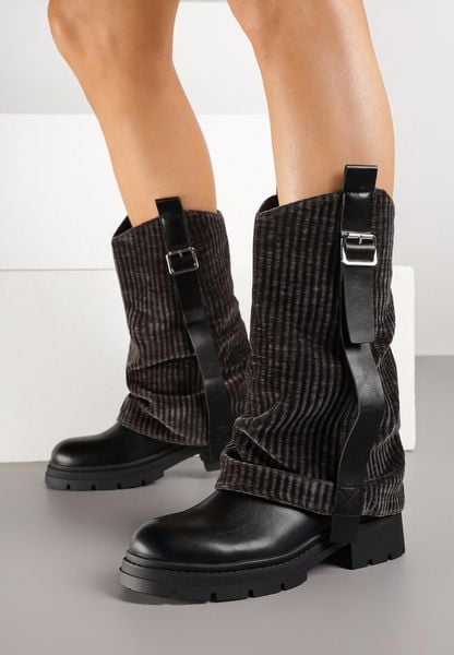 Czarne Botki z Wywiniętą Sztruksową cholewką i Paskiem Allmelia