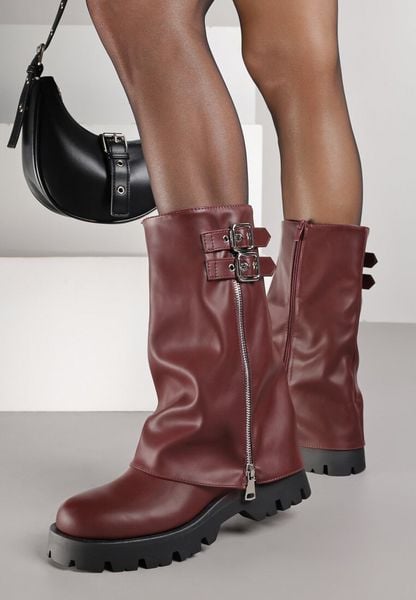 Bordowe Botki Biker z Cholewką Imitującą Nogawkę z Suwakiem i Sprzączkami Vestante