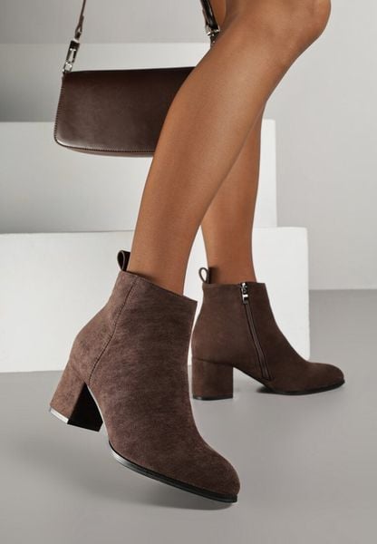 Brązowe Botki Vices do Kostki na Niskim Słupku z Imitacji Zamszu Lannika