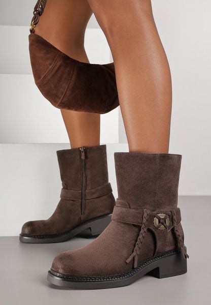 Brązowe Botki w Stylu Biker Ozdobione Plecionym Sznurkiem i Guzikiem Orrizate