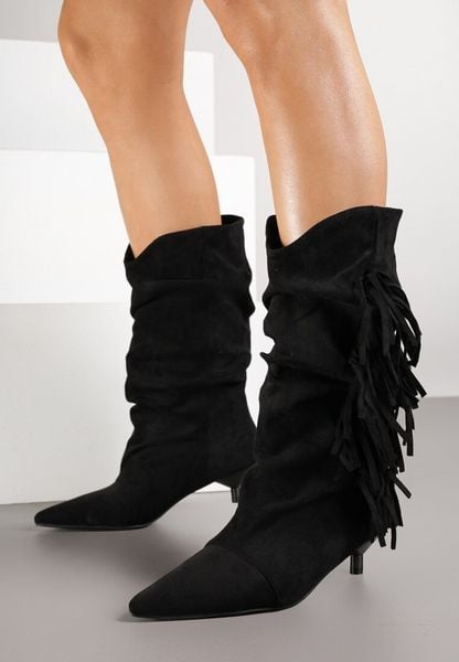 Czarne Botki na Obcasie Typu Kaczuszka z Marszczeniem i Frędzlami Latireia