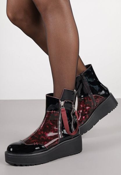 Czarno-Czerwone Botki Lakierowane Vices na Koturnie i Platformie Ozdobione Suwakiem Gattie