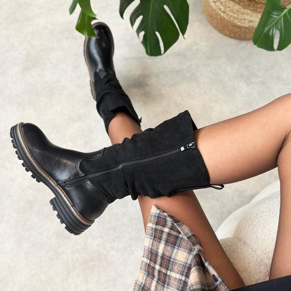 Czarne wysokie botki damskie na traperzeto idealne obuwie na chłodną jesień i zimę, które łączy stylowy wygląd z wygodą i funkcjonalnością. Cholewka wykonana z materiału zamszopodobnego oraz skóropodobnego nadaje im elegancki i nowoczesny charakter, jednocześnie zapewniając trwałość i odporność na codzienne warunki atmosferyczne. Zapięcie na suwak umożliwia szybkie zakładanie i zdejmowanie, a okrągły nosek nadaje […]