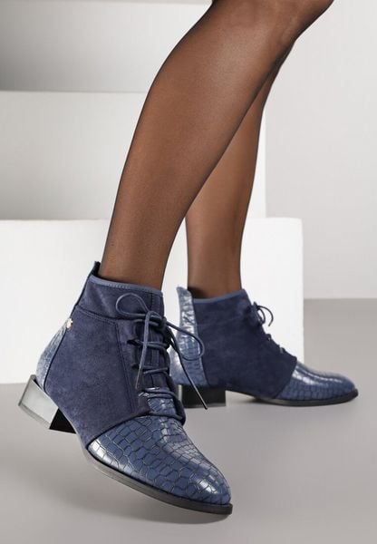 Granatowe Sznurowane Botki Vices do Kostki z Wężowym Tłoczeniem Wodvira