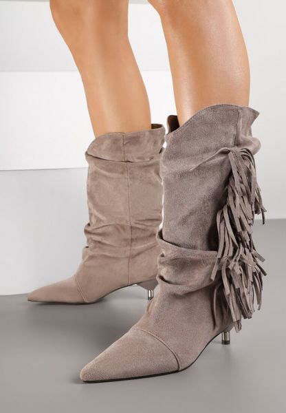 Beżowe Botki na Kaczuszce Ozdobione Frędzlami i Marszczoną Cholewką Latolea