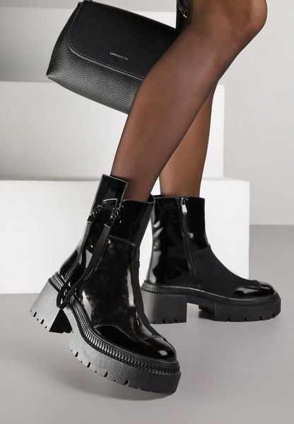 Czarne Lakierowane Botki Vices z Ozdobną Tasiemką Rivavie