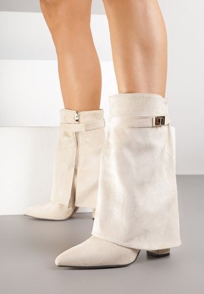 Beżowe Botki z Imitacji Zamszu na Słupku z Wywiniętą Cholewką Eleave