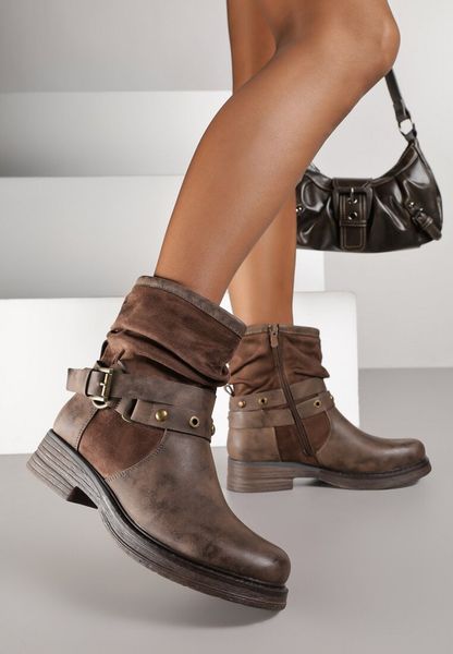 Brązowe Botki w Stylu Biker z Marszczoną Cholewką i Klamrami Claride