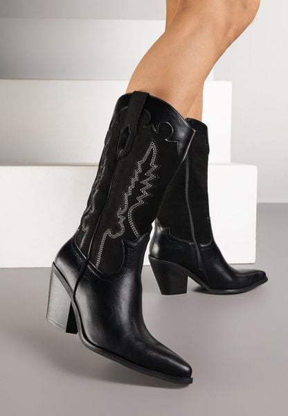 Czarne Botki Typu Kowbojki na Stożku z Haftowaną Cholewką Nalaveia