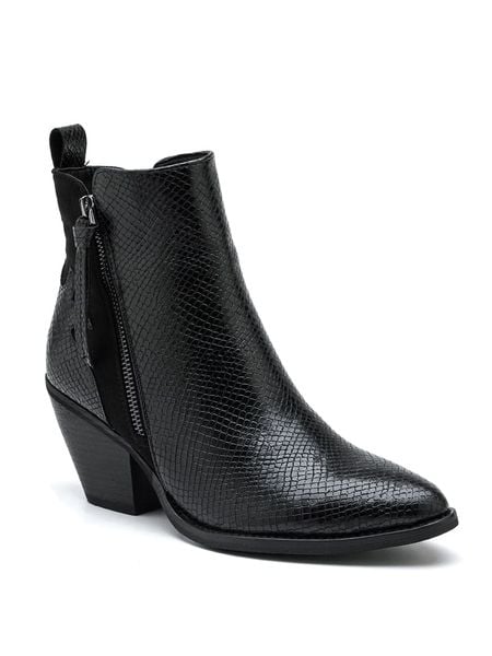 – zapięcie: suwak- praktyczna szlufka ułatwiająca zakładanie- stretchowe wstawki dla optymalnego komfortu- noski: w szpic- noski i zapiętki: wzmocnione- powierzchnia: o fakturze skóry węża- forma obcasa: blokowy- podeszwa: antypoślizgowa