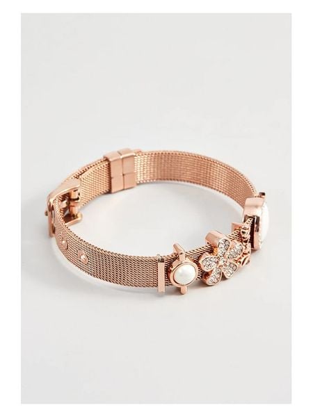 – materiał 1: stal szlachetna- materiał 2: metal- powłoka: różowe złoto- zapięcie: sprzączka- rodzaj kamienia: kryształ- kolor kamienia: białyWskazówka: Zdjęcie produktu w powiększeniu.
