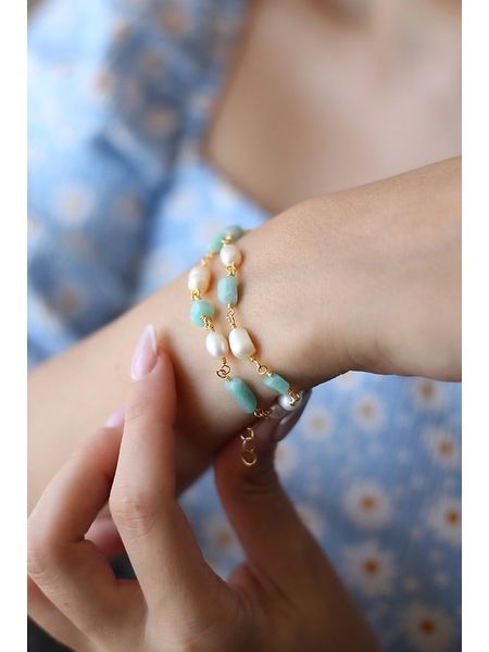 – materiał 1: mosiądz- powłoka: złoto- materiał 2: perły- zapięcie: karabińczyk- regulacja długości: tak- rodzaj kamienia: akwamaryn- kolor kamienia: turkusowyWskazówka: Zdjęcie produktu w powiększeniu.