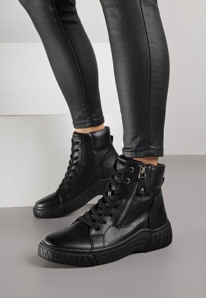 Czarne Sportowe Botki ze Sznurowaną Cholewką i Ozdobnym Suwakiem Ezilare