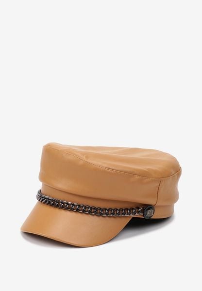Brązowa Czapka Beret z Daszkiem z Ekoskóry z Metalowym Łańcuszkiem Crivite
