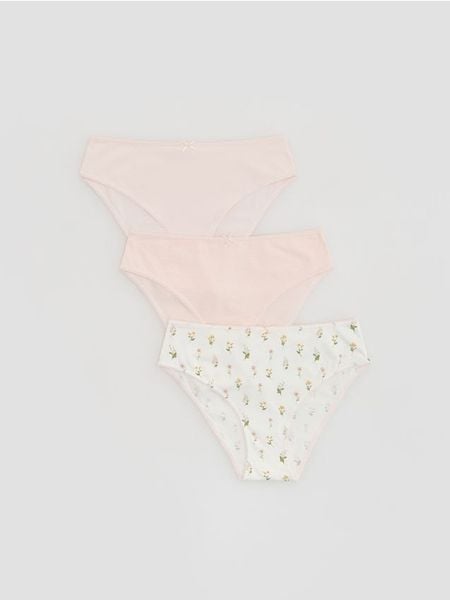 Majtki typu figi, wykonane ze wzorzystej, bawełnianej dzianiny.