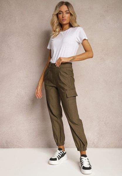 Ciemnozielone Zwężane Spodnie z Gumką w Pasie i Wsuwanymi Kieszeniami Lerana