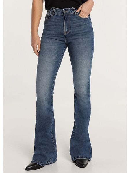 – wysokość pasa: high waist- fason: flared fit- krój nogawek: szeroki- zapięcie: guzik i suwak- szlufki na pasek: tak- kieszenie: 5 klasycznych- przetarcia: tak