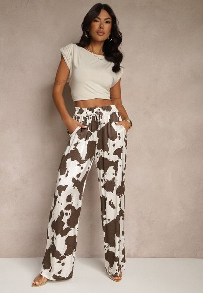 Brązowe Szerokie Spodnie High Waist z Wiskozy w Print w Krowie Łaty Nelianta