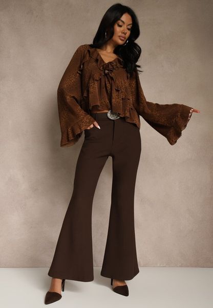 Brązowe Spodnie Flare z Wiskozy i Bawełny z Paskiem w Kowbojskim Stylu Tusiera
