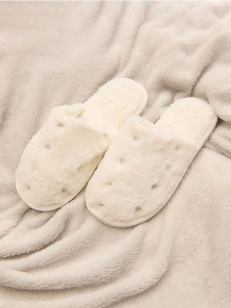 Sinsay – Kapcie – kremowy – ozdobne futerko,płaska podeszwa,ozdobne gwiazki
