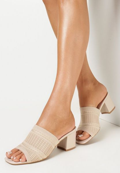 Beżowe Klapki na Słupkowym Obcasie z Szerokim Paskiem Jersee