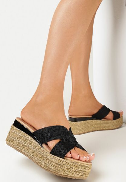 Czarne Klapki na Plecionym Koturnie z Ozdobnym Paskiem Jamita