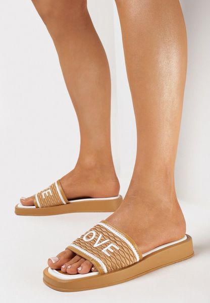 Brązowe Klapki z Kwadratowym Noskiem i Paskiem z Napisem Jeliana