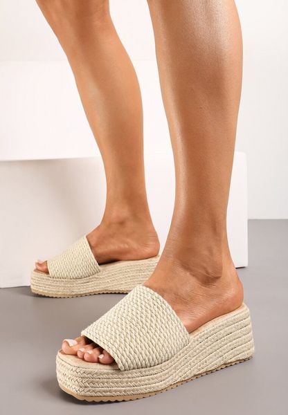Złote Plecione Klapki na Koturnie i Platformie Ozdobione Jutą Moonrissa