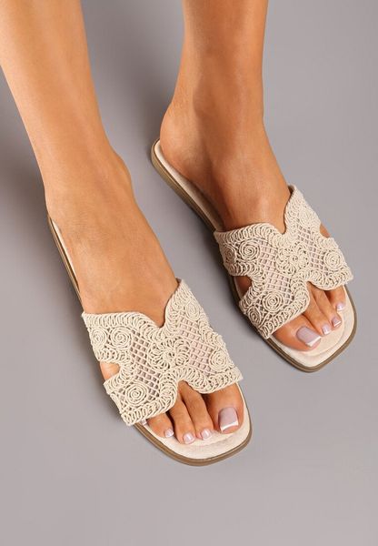 Beżowe Płaskie Klapki Boho z Ażurowym Wzorem Fararia