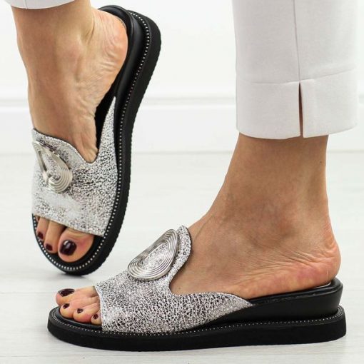 Srebrne klapki damskie na koturnie M.Daszyński 2267-7