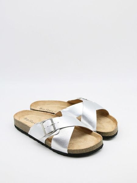 – zapięcie: sprzączka- noski: otwarte- powierzchnia: z metalicznym połyskiem- wkładka: ergonomicznie formowana- podeszwa: antypoślizgowa