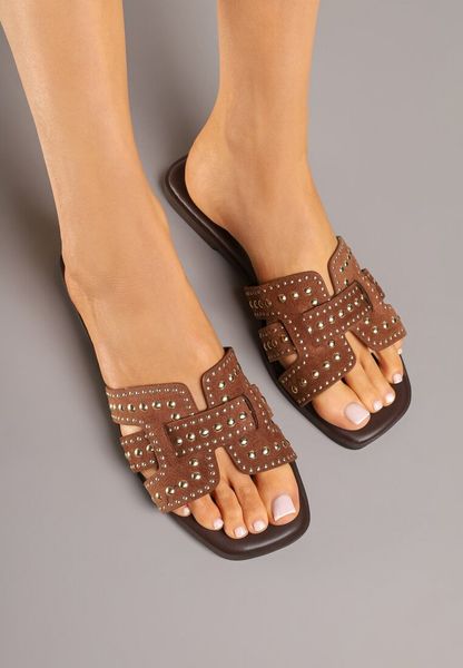 Brązowe Klapki na Płaskiej Podeszwie z Cholewką Zdobioną Nitami Redolinae