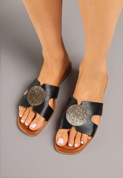 Czarne Klapki Zdobione Metaliczną Aplikacją i Wycięciami w Cholewce Sopeneva