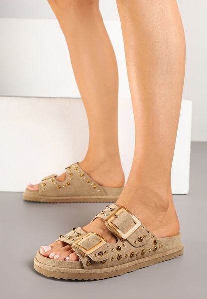 Ciemnobeżowe Klapki z Klamrami i Ozdobnymi Aplikacjami Ellinae