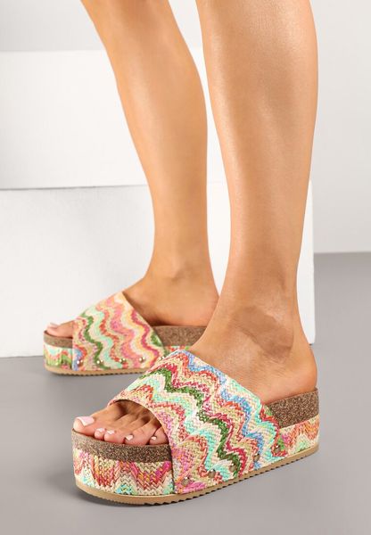 Różowo-Zielone Klapki na Platformie z Plecioną Rafią w Geometryczny Wzór Ciarilane