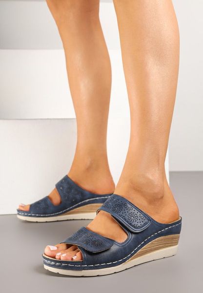 Niebieskie Klapki na Koturnie Zapinane na Rzep z Cyrkoniami Natowena
