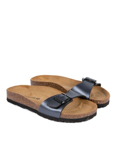 – zapięcie: sprzączka- otwarte noski- wkładka: formowana ergonomicznie- powierzchnia: metalicznie błyszcząca- lekko profilowana podeszwa