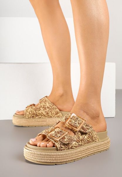 Ciemnobeżowe Klapki na Grubej Podeszwie Ozdobione Plecionką i Klamrami Ronella